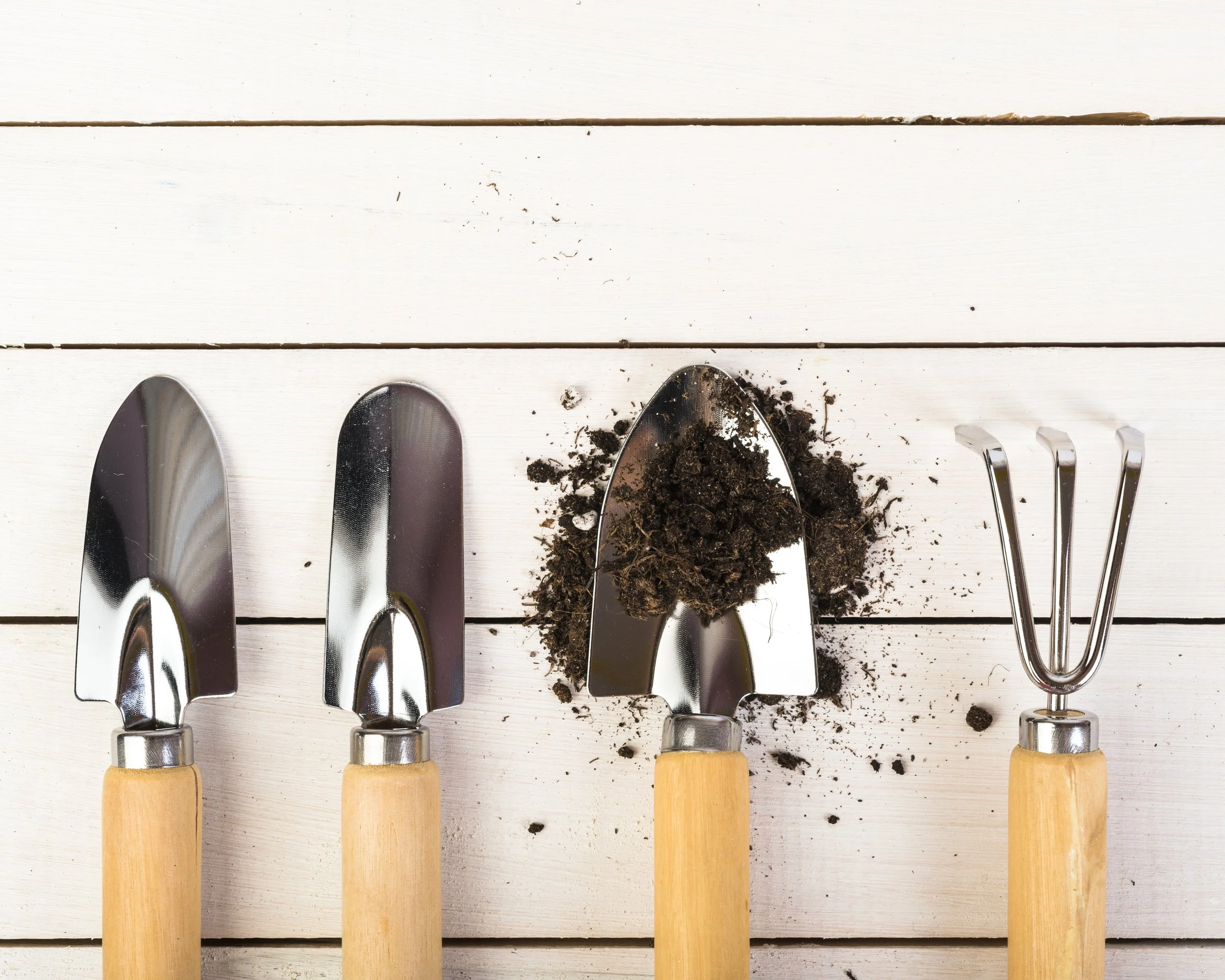 For gardening - trowel / spade, fork, mini pick, cone shape tool, narrow spade with number on it, tape mesuare